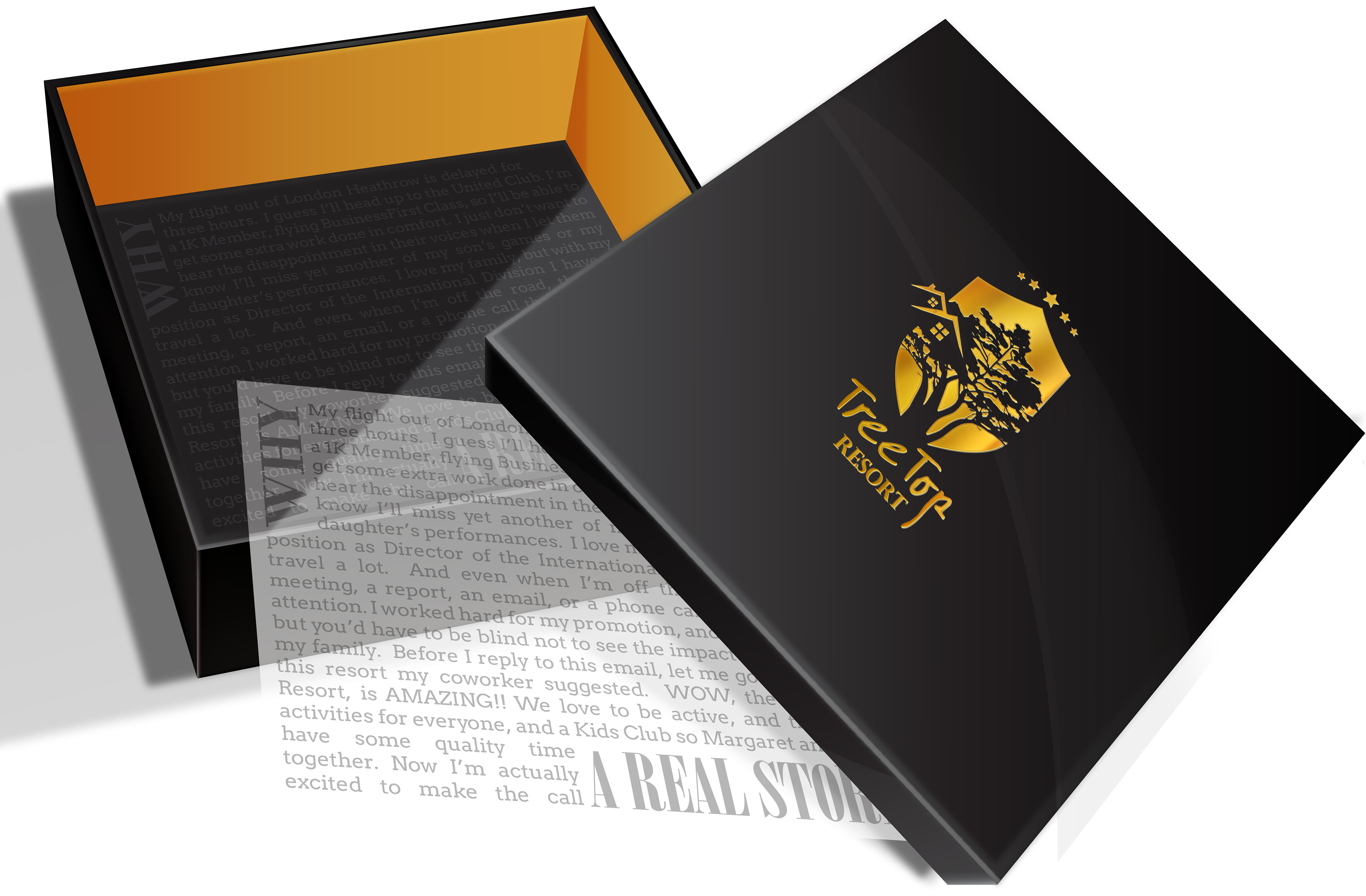 The bottle and package design are aligned into a luxury feeling with the vibrant colors of the branding. In the bottom of the box it comes a clear paper fading into the black bottom giving a chic impression with a true story clients message, it can be a kid story, or man, or woman story but all would be true stories of why the Tree Top Resort make an impact in their lives.